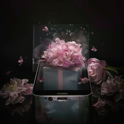 A gift box pops out of the iPhone 15's screen and into reality. The gift box is wrapped in Ripon blended with peony blossoms. Cinematic lighting. Shot with a commercial camera. --v 6.0 --s 250