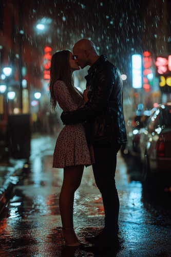 full body shot of bald man kissing girl, hyper realistic, photo taken from distance, snapshot, night street background, wide angle --ar 2:3 --s 250 --v 6.1