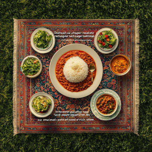 "Overhead view of an inviting Iranian lunch table, covered with a neatly arranged, traditional Iranian tablecloth, captured in hyper-realistic detail. At the center, a large tray of fluffy, perfectly cooked Iranian rice with a light sprinkle of golden saffron sits prominently. Surrounding the rice are carefully spaced dishes, including a small plate of rich stew, a bowl of creamy yogurt, and a dish of fresh herbs (sabzi khordan), all positioned within the tablecloth area, creating a tidy and balanced arrangement. The setting is modest yet visually captivating, emphasizing authentic Iranian dining elements. The table rests on a lush green lawn, with vibrant grass framing the scene for a cozy, outdoor dining experience."