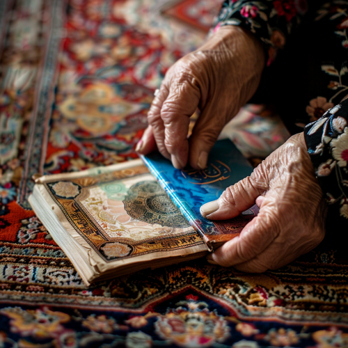 close up photography of iranian grandmams hand that siting on praying rugs, traditional rug with termeh pattern, blue tasbih, Quran book with crisp banknotes placed in quran, ultra HD--v:6.0-- s 250