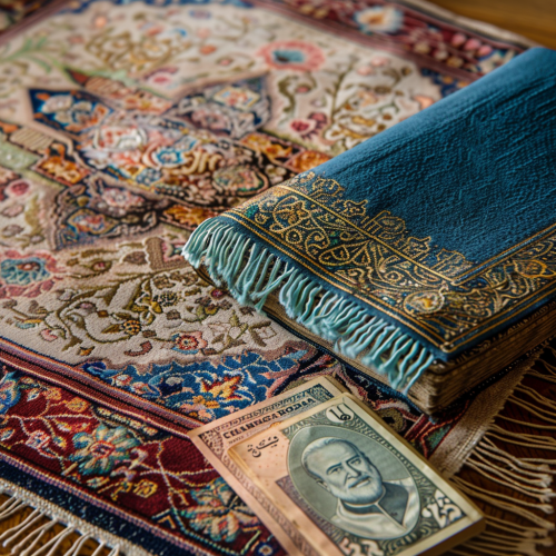 close-up view highlighting the intricate details of an Iranian grandmother's Termeh prayer rug, along with a blue Tasbih, an Iranian rug, a Quran book, and crisp banknotes placed inside the Quran as Eidi. This image captures the cultural richness and the blend of tradition and celebration. If you have any more requests or need further adjustments--v:6.0