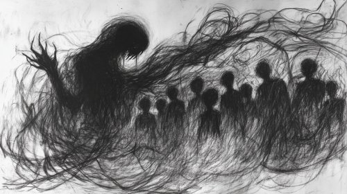 A rough, chaotic pencil sketch with unsettling, mysterious, spiritual, chaotic pencil lines, depicting a scene where a menacing, shadowy figure looms over a group of silent, passive figures. The shadowy figure represents cruelty and oppression, while the silent figures symbolize the tragic inaction of good people. The lines are jagged and abstract, creating a sense of tension and unease. The background is filled with swirling, dark patterns that highlight the contrast between the oppressor and the silent witnesses, emphasizing the weight of their inaction. The overall image is intentionally rough and sketch-like, capturing the profound and unsettling tragedy of silence in the face of evil. --c 8 --ar 3:4 --v 6.1