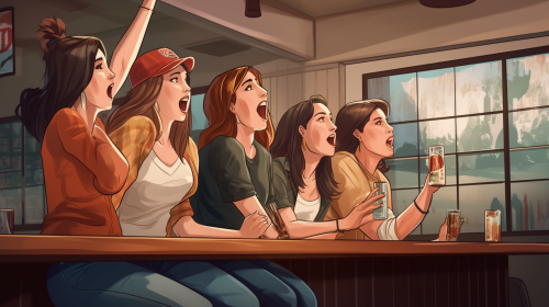 a vector illustration of four excited women watching football on a large TV sitting together in a sports bar set in 2023 in the style of Norman Rockwell --ar 16:9 --v 5.0