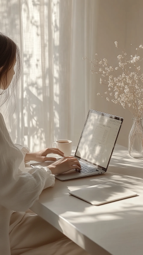 An image of a confident woman sitting at a desk, focusing intently on her planner or journal. Around her are symbols of healthy habits like a yoga mat, a glass of water, and a clock. The scene feels modern and minimalistic, with soft lighting, creating an atmosphere of focus and dedication. The background is subtly blurred, highlighting the woman as she works on establishing her new routines, with a sense of accomplishment and motivation. High resolution, 1920x1080 pixels, --ar 16:9