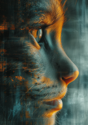 Before the sun sets, reflections. Divine Artistic experimentation god or godess image with cougar, a divinities styles, and a Abstract view --v 6.0 --c 15 --ar 5:7 --s 750