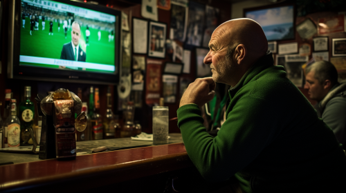1920s half-length photo portrait of Irish shopkeeper, 39 years, stern face, red hair, early baldness, business suit, cigar in hand, clear facial features, 35mm lens, f/1.8, accent lighting, global illumination q 2 --ar 2:3