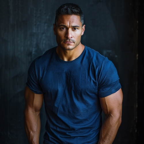handsome gay latino man wearing blue navy t-shirt, blue jeans, posing, mysterious, night, textured black background --s 250 --v 6.0 --style raw