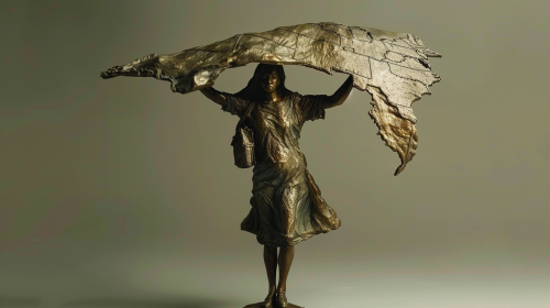 A photo of a bronze statue depicting a towering woman, standing in a slightly crouched pose, straining under the immense weight of a model of the map of the United States on her shoulders. Her head is slightly bowed, and Her arms are stretched upwards, supporting the model. --ar 16:9 --v 6.0
