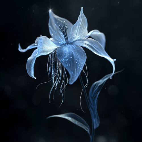in 2d digital art but somewhat realistic, A delicate, silver-blue flower with thin, drooping petals that curl inward like a bell. The plant’s stem is covered in a fine layer of ash, and it releases a subtle glow when touched. The flower is faintly luminescent in the dark.