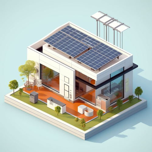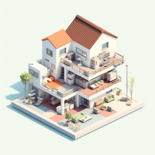 isometric graphic with a digital schematic of a building. No people. No text. Dark mode. Use red and white highlights (this red: #C9242C)