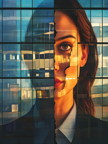 The reflection of an office worker woman in a glass building, with one half of the reflection showing a confident, ethical persona and the other half showing a stressed or conflicted individual. --v 6.1 --ar 3:4