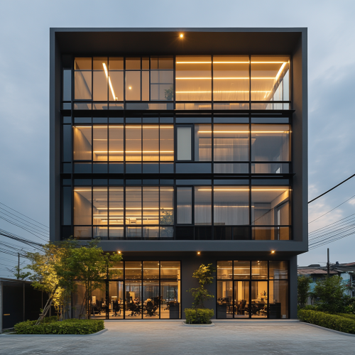 Office top of industrial hall with roof lights, made for a company that deals in refurbished heavy steel industrial machines. Architecture in googie style with rounded elements. The facade of the building with aluminium to reflect the material of the reused machines. For the facade Take inspiration from the aluminium facade of 1950’s American diners in googie style.