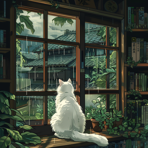 Create a comic-style, Lofi Girl vibe drawing of a realistic white Sacred Birman cat, seen from behind, sitting in a cozy library. The cat is looking out a small window, perfectly sized for it, towards a traditional Japanese village scene outside. It's night, and rain is gently falling, creating a calming atmosphere. The interior is filled with lush green plants and bookshelves, adding to the cocooning ambiance. The style should be realistic yet charming, capturing the quiet and peaceful moment with detailed textures and a touch of warmth. The scene evokes a sense of comfort, contemplation, and connection with nature --ar 1:1 --s 250 --v 6.0