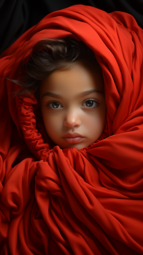 bébé avec une grande couverture de lit rouge, leica render --ar 9:16 --s 750