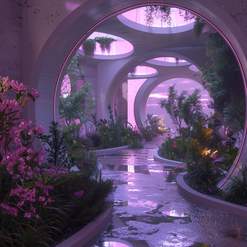 the following background for a scenario: The aesthetic is represented by a futuristic cosmos nature paradise with a calm environment, with soft colors creating a dreamy atmosphere