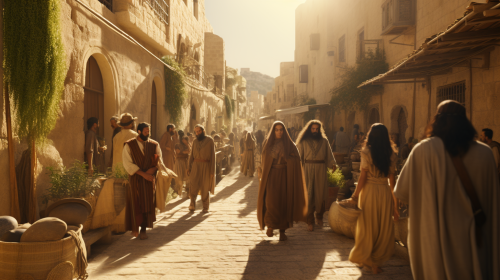 ancient israel, people on street, 8k, cinematic --ar 16:9 --style raw