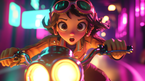3D animated Disney-style character riding a motorcycle, with a wide-eyed surprised expression as they almost collide with a car, adorable cartoonish features, vibrant colors, soft lighting for a whimsical look --ar 16:9 --v 6.1