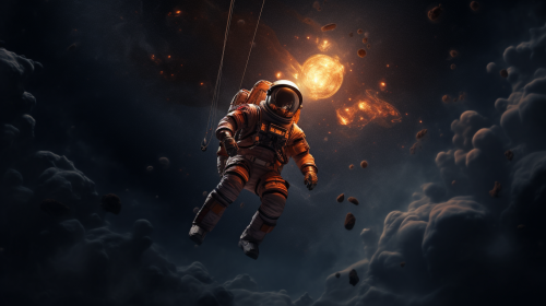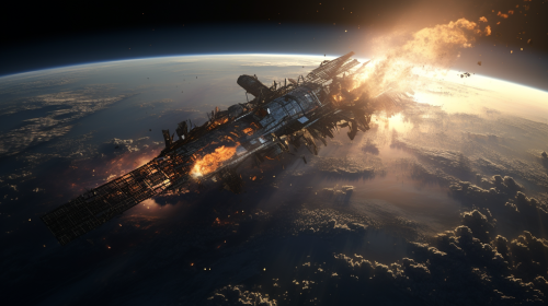 Two ISS orbiting Earth collide in a catastrophic event, creating a spectacular cosmic disaster. Debris scatters in all directions, reflecting the glint of sunlight as it spreads across the vastness of space. The remnants of the stations form a haunting silhouette against the backdrop of Earth, a chilling reminder of the risks of exploration. --ar 16:9