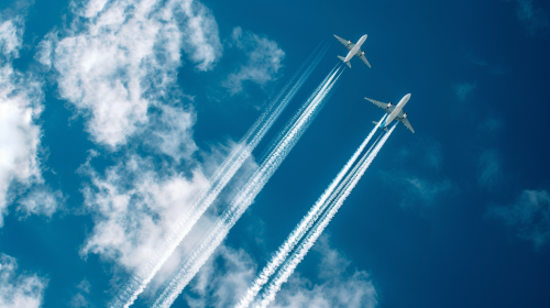 the blue sky, white clouds, an airliner which leaves a trail behind it, --v 6.0 --ar 16:9
