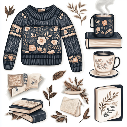 A digital cohesive sub,imation design, cozy-themed items, floral items, a detailed knit sweater, steaming mug, books, all arranged and isolated on a white background, peachy, navy and coordinating colors, trending cozy style, Folk art, 2d, icons, trending junk journal style, sticker art, hyper-realistic, high quality