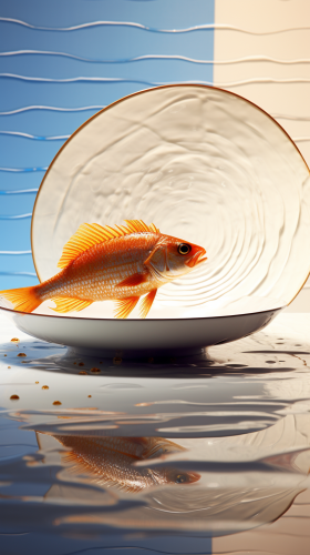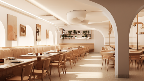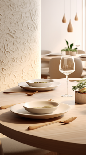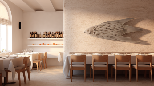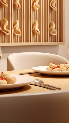 Interior design 3D rendering for Michelin star rated Italian restaurant named Bagatto, closeup of paccheri dish, located in Carloforte Italy, Mediterranean minimalism, --ar 9:16