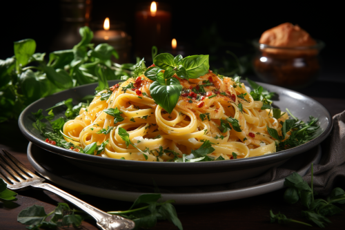 italian noodles with fresh herbs on light background. --ar 3:2 --s 750
