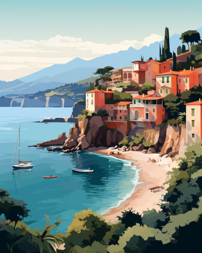 italian riviera landscape coast, in the style of modernist landscapes, atmospheric color washes, majestic ports, layered landscapes, rough-edged 2d animation --ar 4:5
