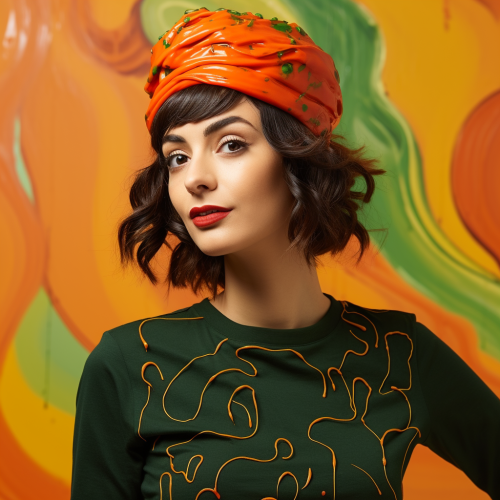 chic Italian woman wearing noodle hat, sriracha sauce splash, surrealist, green shirt, orange background