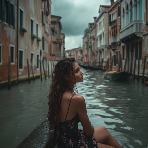 4w cute girl in a venetian canal, gloomy, rainy, dark clouds, fisheye, gopro, technicolor cinemascope dvd screengrab movie, 2024 ultra detailed, soft lighting, beautifully color graded, Unreal Engine, Cinematic , Color Grading, Photoshoot, Shot on 85mm lens, f1.2, Depth of Field, DOF, 32k, Super-Resolution, Megapixel, Backlight, Natural Lighting, Soft Lighting, Conte-Jour, Beautiful Lighting, Global Illumination, hyper maximalist , elegant, dynamic pose, photorealistic, 8K, volumetric lighting , high contrast , HDR , --style raw --v 6.1