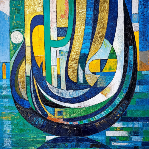 make a Picasso landscape in crayon in the form of a drawing of the reflection of gondoliers in the waters of Venice, Encaustic oil paint, neon blue and fluo yellow and electric green and turquoise .Pintura cubista geometrica curva com impasto with gold and white, curved and waves line.