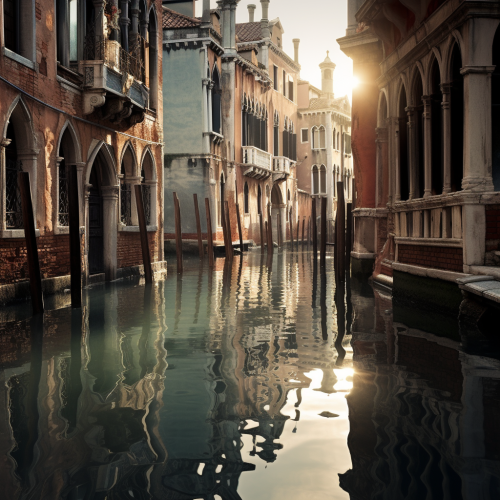 photography of the serene cityscape of Venice, Italy, with the San Giorgio Maggiore in the background. The calm waters reflect the grand buildings, while wooden poles depicts roman statues. A long exposure creates sottness in the water and sky, adding depth and contrast to the scene. This photograph captures the beauty and tranquility that makes the Venetian style iconic. --ar 16:9