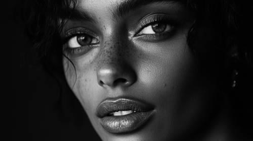 Perfect portrait of a Kenyan women, editorial, vogue portrait, studio professional photoshoot, black background, perfect skin texture, hyper detailed black and white portrait, photo realistic --ar 16:9 --v 6.1