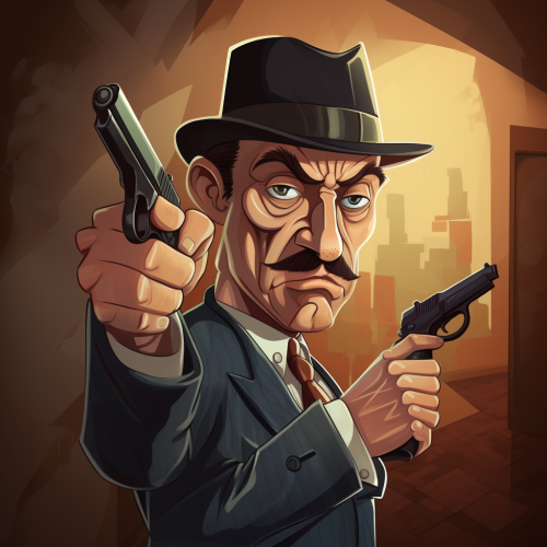 game art, a goofy, silly, hand drawn, 1920's character, Ivan the Informant, mobsters, in the style of Cyanide and Happiness