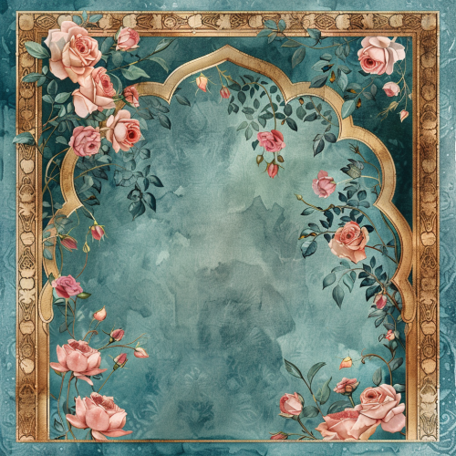 gold arabic arch frame on watercolor teal background, with pink roses --s 250 --v 6.0