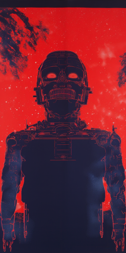 Black canvas, black over black, Minimalism, Duotone red neon and indigo color, drawing of a sci - fi poster with futuristic hi - tech robot suspended in the sky, in the style of delicate etchings, distorted figures, emphasis on facial expressions ::1 Wires, cables ::-0.5 --v 5.2 --ar 1:2