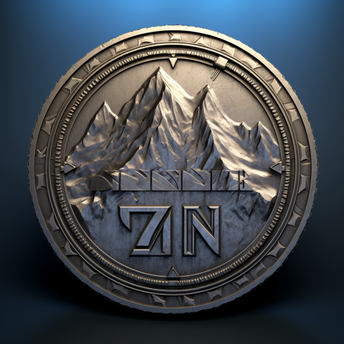 the letters "IZN" on the coin on the snow mountain. simple, cyberpunk --ar 1:1