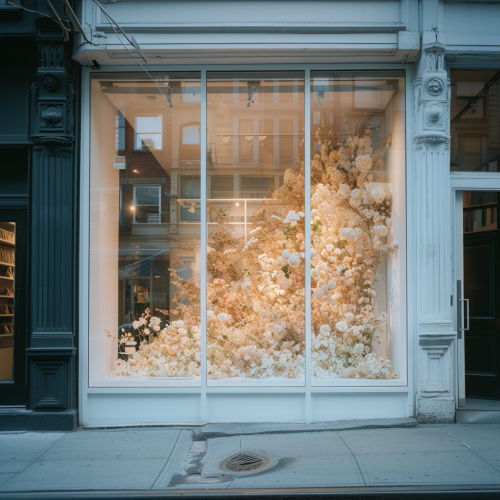 an empty vitrine store in soho, New York with a large floral installation in offwhite neutral tones in the centre of the space, viewed from the street. Soft evening light shot by Petra Collins, --v 6.0