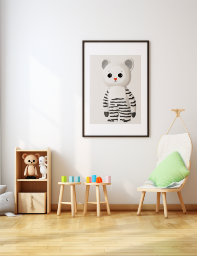 Stylish interior design of child room with mockup poster frame for kids, design furniture, wooden toys and cute children`s accessories, white walls. High contrast. playroom decor. Template. --ar 17:22