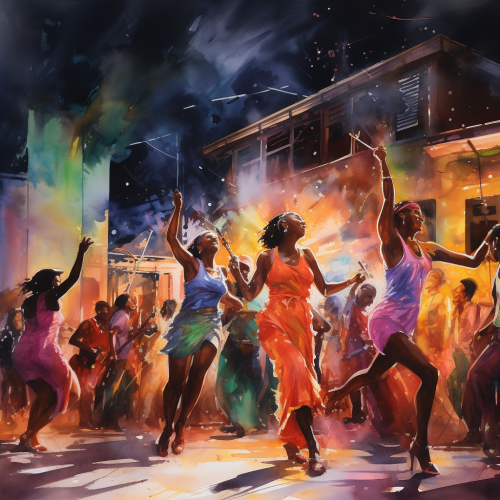water color painting of jamaican ladies dancing to reggae at street party in the night, bright lights, dreamy, surrealism, abstract art, distressed art