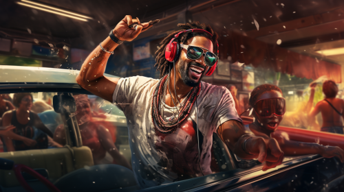a dj playing music in a car wash for a group of people, Caribbean, dancing, excitement, urban, hip-hop, dancehall, realistic, --ar 16:9