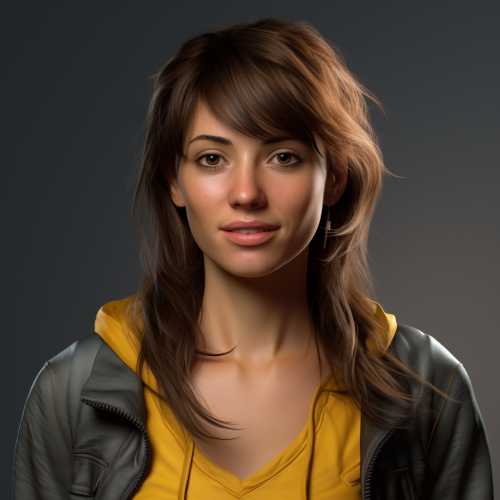 Image of female named Jane in advanced 3D model style, 32 years old. A young successful mother who likes technology and is always wearing yellow, red and blue