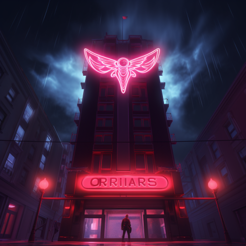 create a red neon sign on top of a city building that says "ORBIS PARANORMAL". Make the view of it nighttime. Above the sign show a UFO, a ghost flying and a mothman flying.
