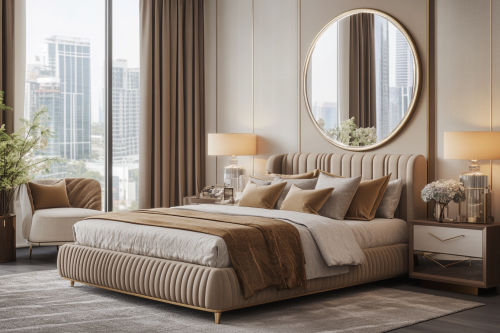 A luxurious bedroom with an elegant bed, large mirror, and dressing table, featuring beige walls, grey carpeting, warm lighting, modern furniture, and a window view of the cityscape. This is a 3D rendering, a work of digital art, in the style of modern interior design. --ar 128:85