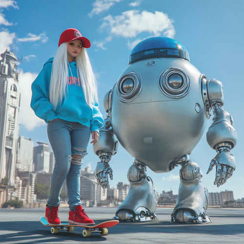 Realistic photo. The woman with long white hair wearing a red hat riding a skateboard is a young Japanese woman wearing a blue hoodie, thick jeans, and red sneakers. Next to it is a two-headed, large-eyed robot with a very round body made of silver stainless steel and a blue hat, riding a skateboard. In the background is a city like a science fiction movie.