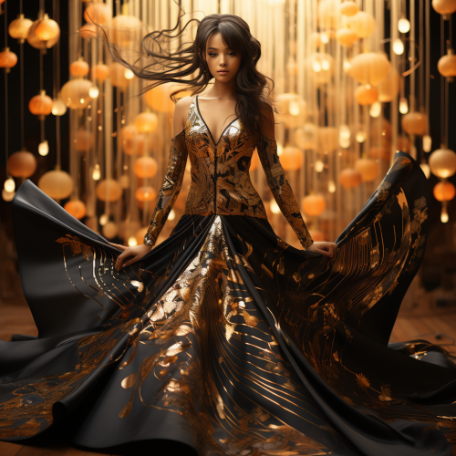 unique sparkly digital paper,Japanese Beauty,full body,whole body,Wearing a Japanese patterned black dress with gold accents Costume,Japanese geta,photo is hyperrealistic,Dynamic Pose,picture books,The world's most complex,epic,masterpiece,8k--ar 91:128 --s 750 --style raw