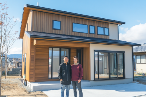 Realistic photo of a 30-year-old Japanese couple with a youthful appearance, standing in front of a newly built single-family house, couple clearly visible in the center, both showing smooth skin and vibrant expressions, house facade also visible but not overwhelming. Photorealistic, realistic image, 8K resolution --ar 3:2 --v 6.1 --style raw