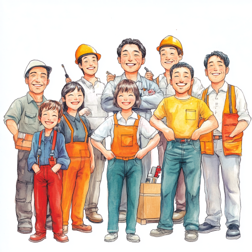 A group of happy representatives of Taiwanese and Japanese professionals, including plumbers, computer engineers, painters, bakers, and architects, the background is a white --ar 1:1 --v 6.1