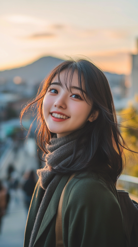 A realistic portrait of a beautiful Japanese university student, looking excited and happy while walking through Nagasaki’s vibrant streets. The background shows Mount Inasa and the Nagasaki skyline in the distance. Soft natural lighting illuminates her face with warm sunlight, gentle wind moves her hair. Created using: outdoor lens, street photography, light HDR, dynamic focus, cityscape elements, natural color palette, joyful expression --ar 9:16 --v 6.1