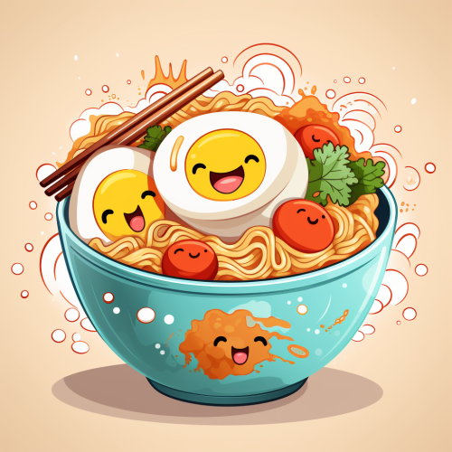 japanese style, happy bowl of ramen, cartoon, illustration, white background