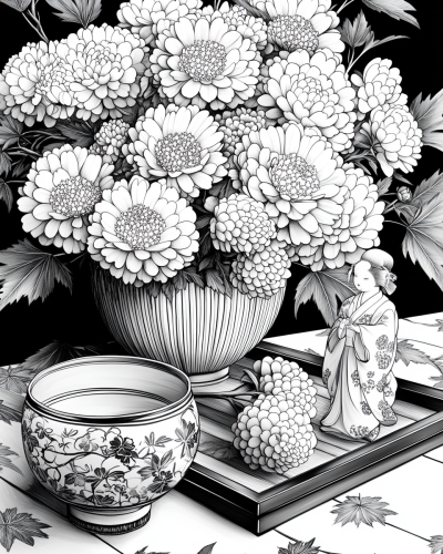 Create a black and white coloring page illustration of an arrangement of a variety of beautiful Japanese grown flowers arranged in an Ikebana style in a low rectangular ceramic tray. A Geisha Doll is next to the arrangement on the Japanese style table. Most of this image is white with clean and clear and crisp lines No shading or shadows on this illustration. The background is white. --ar 4:5 --v 6.1 --stylize 500